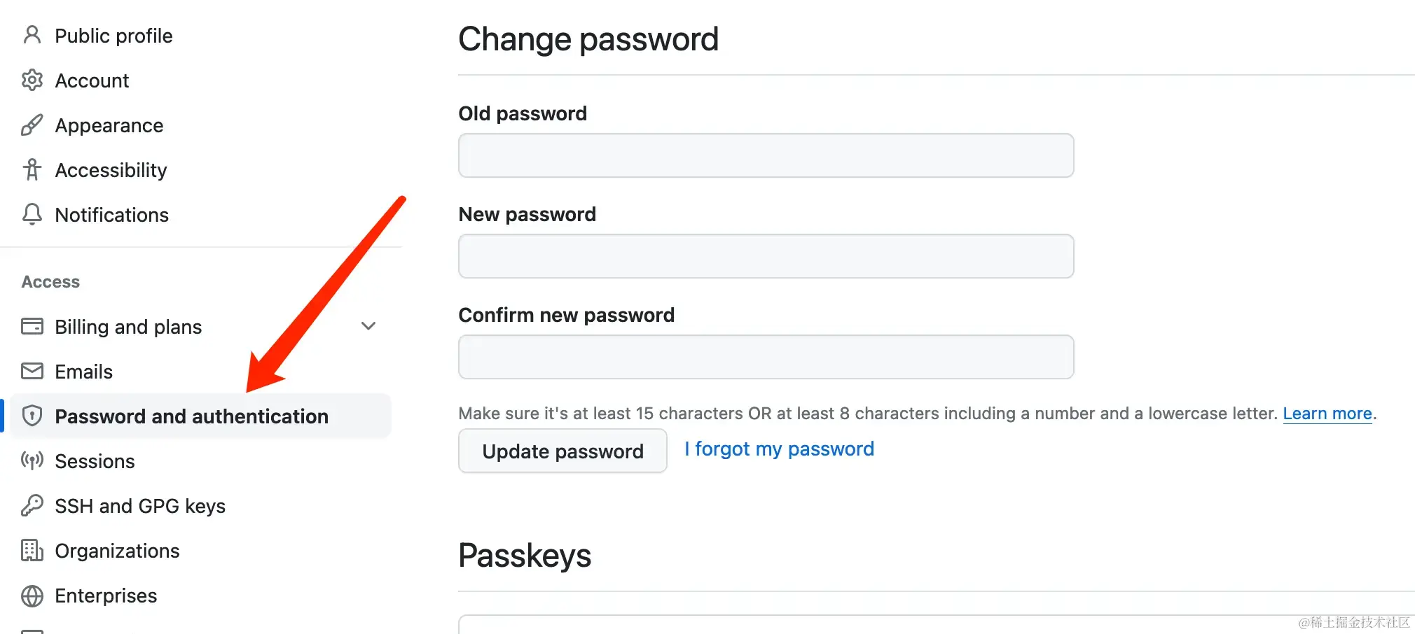 - 在左侧的菜单中找到 Password and authentication