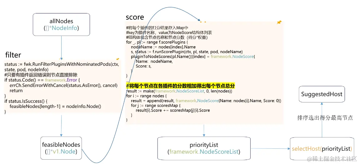 调度器预选阶段对应filter,主要用于过滤不满足Pod调度条件的节点;优选阶段对应score,主要用于为每个节点打分,节点分数=插件打分*插件权重;然后排序选出分数最高的节点