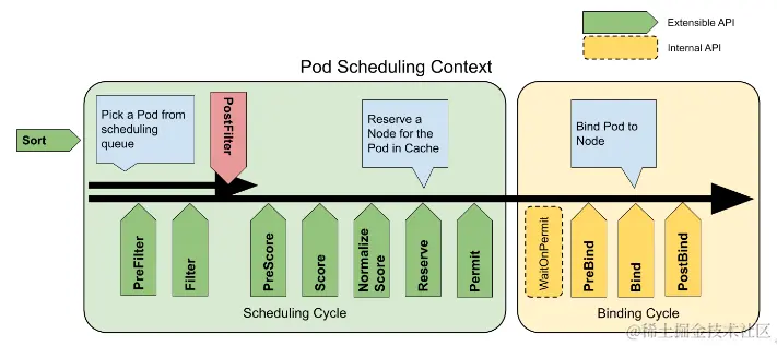 - PostBind: 这是个信息性的扩展点。绑定后插件在 Pod 成功绑定后被调用。这是绑定周期的结尾,可用于清理相关的资源