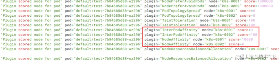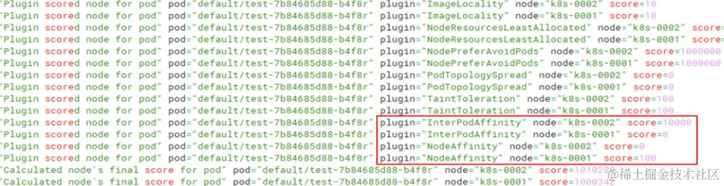 查看kube-scheduler调度日志,k8s-002 score得分为打分100 * 权重 100共得10000分,调度到k8s-002节点上