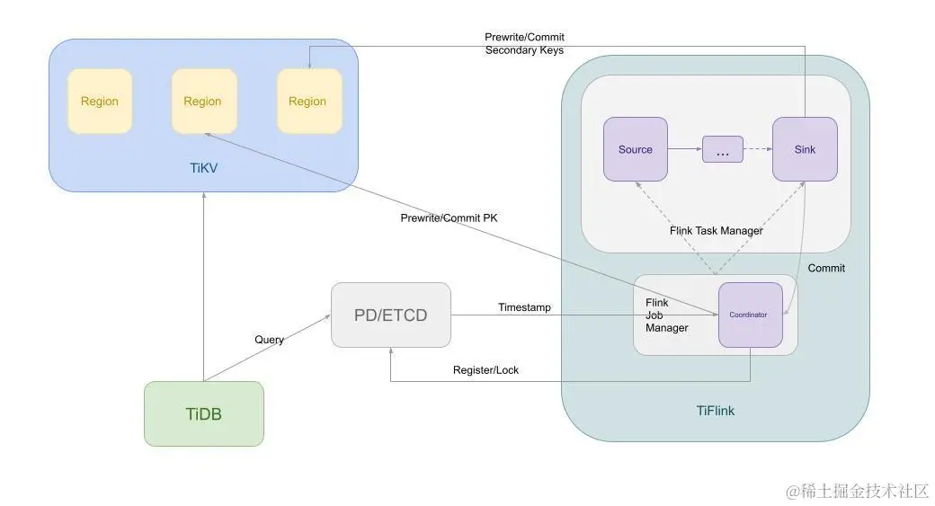 - TiKV 提供了基于 Percolator 模型的事务支持和 MVCC,这是 TiFlink 实现强一致流处理的基础。在下文中可以看到,TiFlink 对 TiKV 的写入主要是以接连不断的事务的形式进行的。