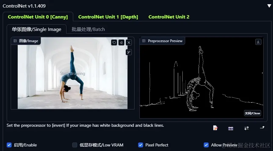 不过还好Stable Diffusion有ControlNet插件,可以把Unsplash的图上传给Stable Diffusion做参考。通过Canny可以预先生成一个画面的大致轮廓,从而比较精准地控制画面的构图。通过Depth可以生成一幅黑白的深度图,从而可以比较精确地控制画面的纵深。