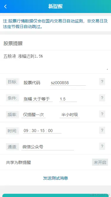 示例:涨幅:大于等于:1.3 代表涨幅大于等于1.3时发送提醒。1.3为你填写的涨幅,支持-10至10
