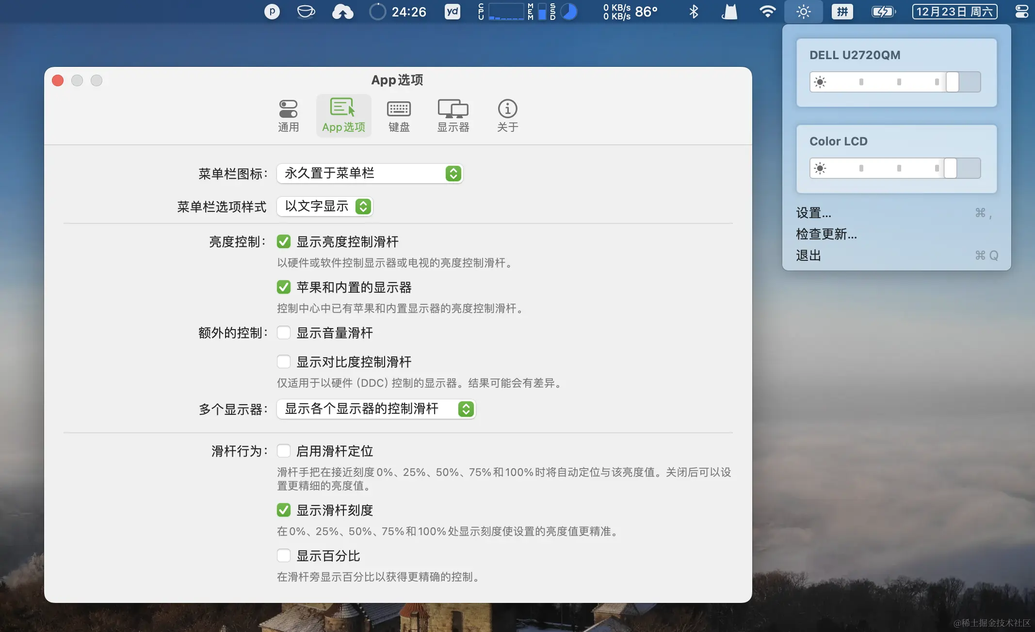 MacOS 自带的显示器亮度控制智能控制 Macbook 自带显示器的亮度,这个应用可以控制外置显示器的亮度。
