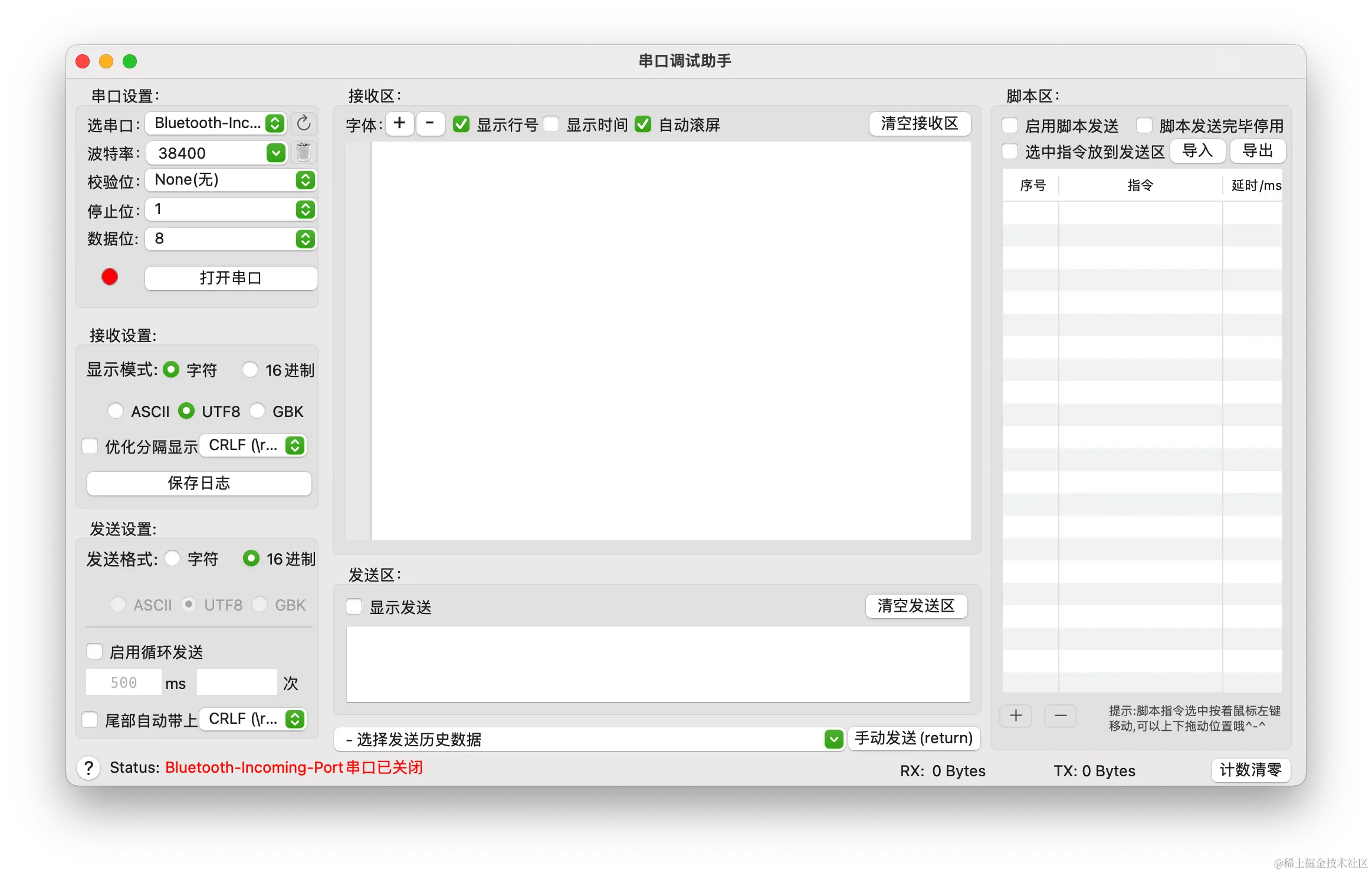 试用了多款 Mac 上的串口调试助手,发现这款比较好用,有基本的串口、波特率、校验位、停止位、数据位、字符和十六进制收发等等外,还支持脚本功能。