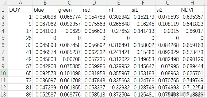 我们现在的需求是,希望对于每一个名称为Ref_GRA_Y.csv格式的.csv文件,求取其中每一个单元格在所有文件中数据的平均值。例如,对于上图中DOY为1的blue这个单元格,那么求出来的平均值就是在全部名称为Ref_GRA_Y.csv格式的.csv文件之中,DOY为1且列名为blue的单元格的平均值。此外,如果像上图一样,出现了部分单元格数值为0的情况,表明在当前文件夹下,这个单元格是没有数据的,因此需要在计算的时候舍去(并且取平均值时候的分母也要减小1)。