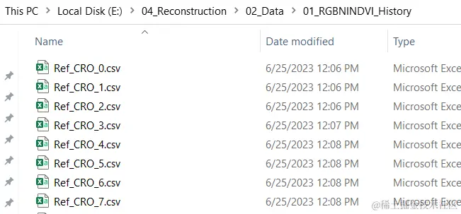 首先,我们来明确一下本文的具体需求。现有一个文件夹,其中有如下所示的大量Excel文件,我们这里就以.csv文件为例来介绍。其中,每一个.csv文件的名称都是如下图所示的Ref_XXX_Y.csv格式的,其中XXX表示三个字母,后面的Y则表示若干位数字。