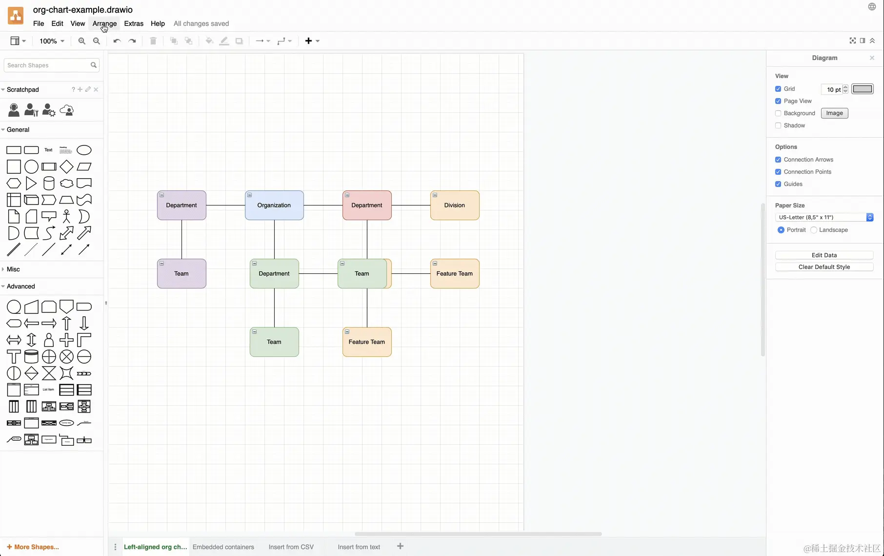 - 点击Arrange>Insert > Layout > Org. 组织结构图有许多不同的常用布局。