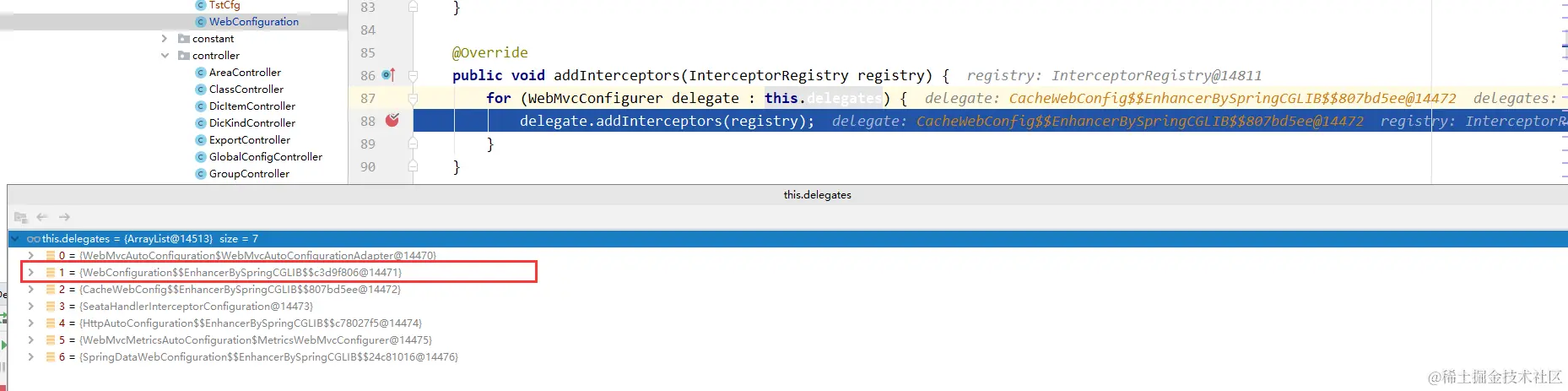 其实就是在springboot启动时执行doCreateBean时,进行调用创建的org.springframework.boot.autoconfigure.web.servlet.WebMvcAutoConfiguration$EnableWebMvcConfiguration会在这里放入进去所有实现了WebMvcConfigurer接口的类,一共有7个,其中就有我们自己实现了WebMvcConfigurer接口的WebConfiguration类,