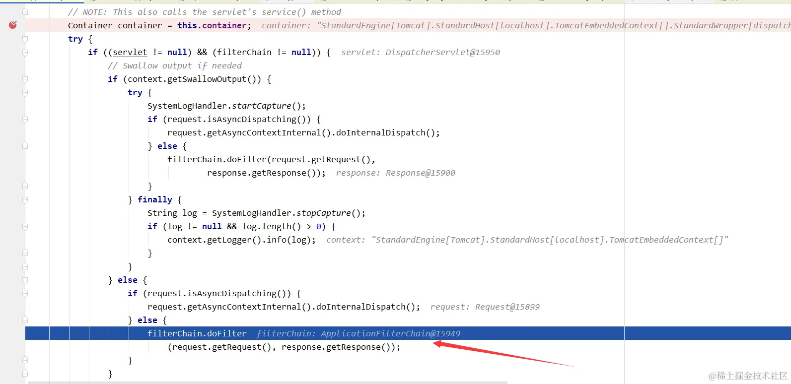 第二步:当然不会先走我们的拦截器了,我们的拦截器是在Springboot框架进行管理的,现在还在servlet,所以会先走到filter过滤器这一步,来贴图:官方代码太长,一屏截不下,前面有一个创建过滤器链的过程:等下次在给大家讲一下jetty的过滤器链与tomcat的过滤器链的区别