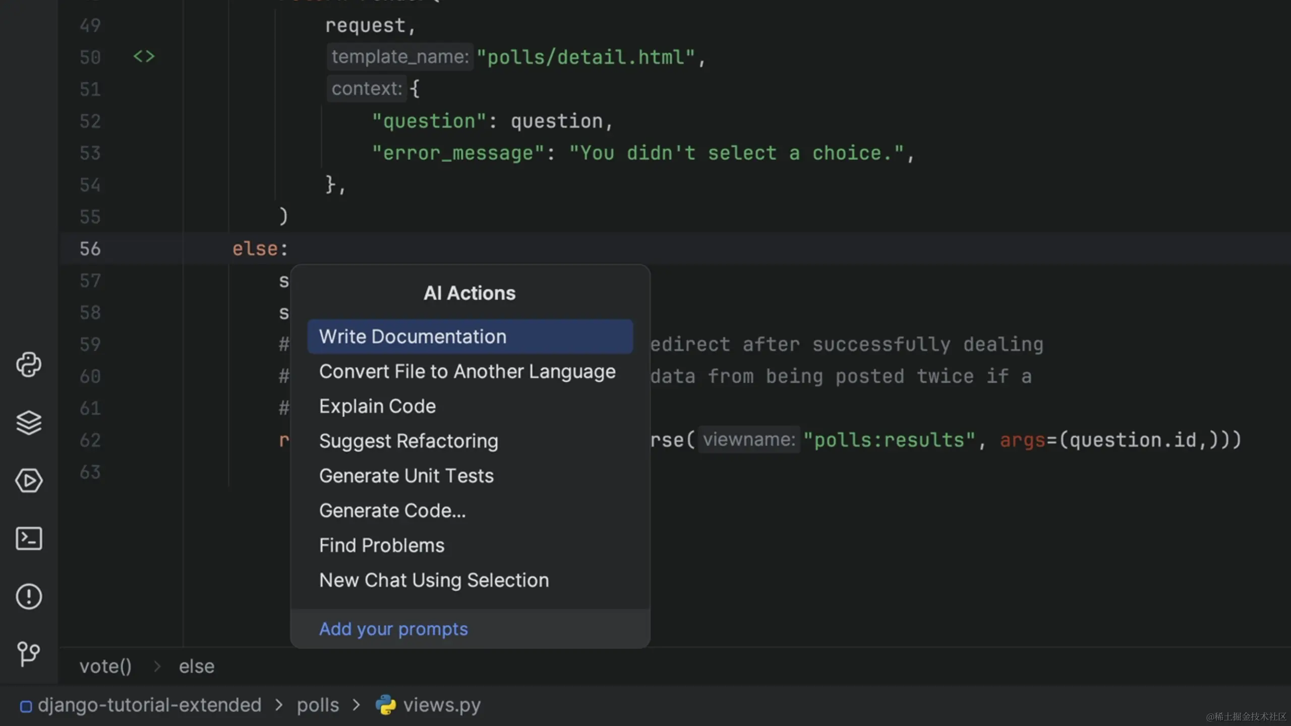 只需在聊天中提出问题,AI Assistant 就会自动使用项目上下文中的必要详细信息来补充您的查询。无需复制和粘贴代码片段,只需为 JetBrains AI 提供“解释打开文件中的代码”或“将 MyClass 重写为抽象类”等任务。