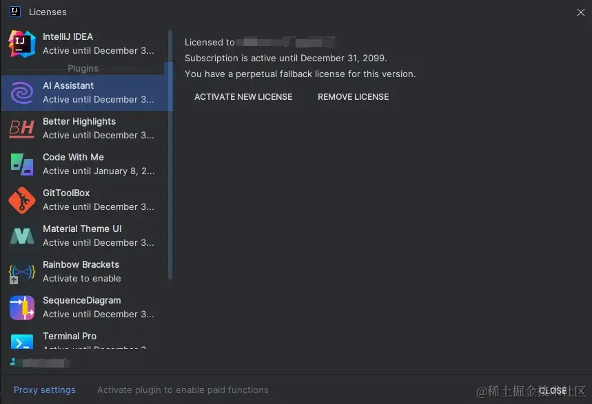 - Licensed即表示激活成功,可以看到 Ai Assistant插件也能够解锁,点击continue关掉窗口就好了!