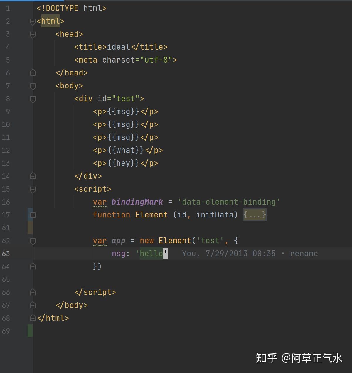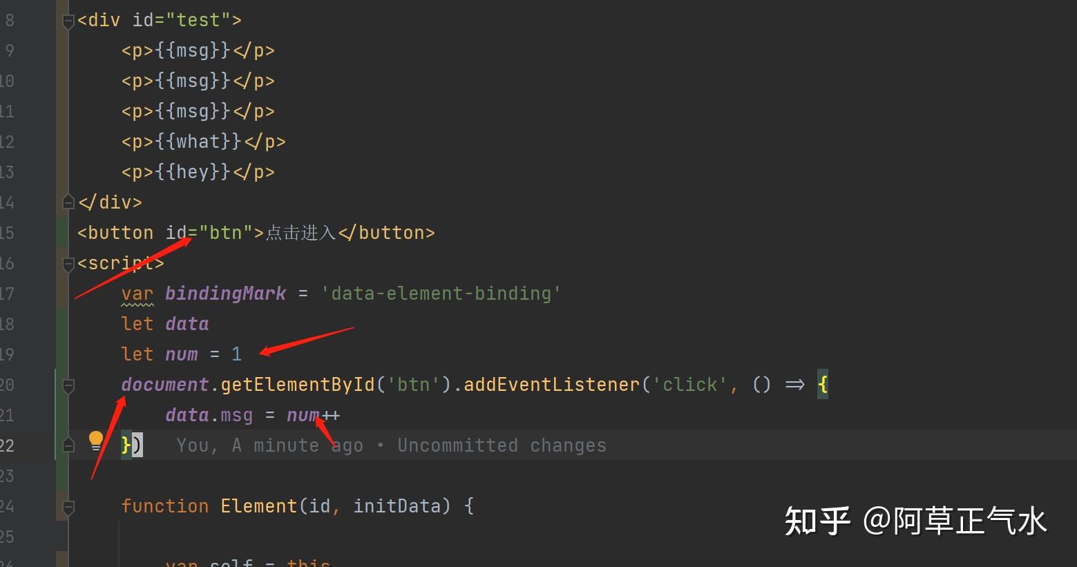 将函数本身指向 self , 去获取 id 为 test 的 dom 元素,创建一个空对象 bindings,定义 data 和 self.data,并且将这俩指向同一个地址,定义 content 等于 el.innerHTML.replace(/\{\{(.*)\}\}/g, markToken),然后,直接将 dom 元素的内容赋值为刚刚初始化完成的 content
