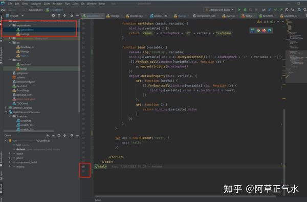 可以看到,作者进行了尝试,用短短 70 行代码就实现了 vue 的最初版雏形