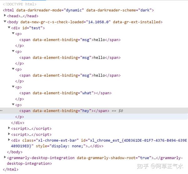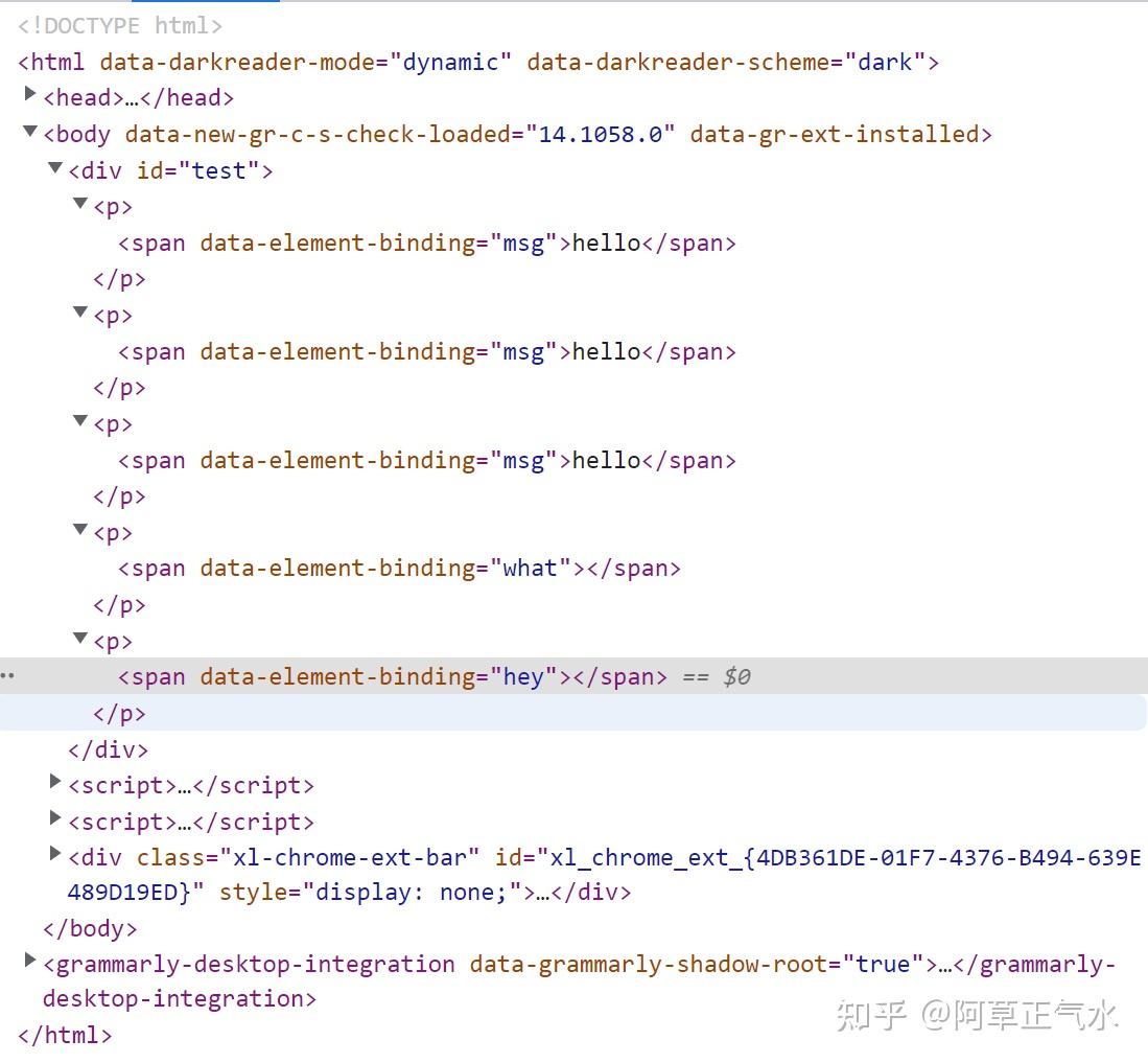然后执行 bind 函数,先是使用 querySelectorAll 去获取一个类数组对象,也就是节点列表,将获取到的节点列表赋值到 bindings[variable] 的 els 属性上,赋值完成后将自定义的标签数据进行了移除,现在的 bindings 是这个样子的