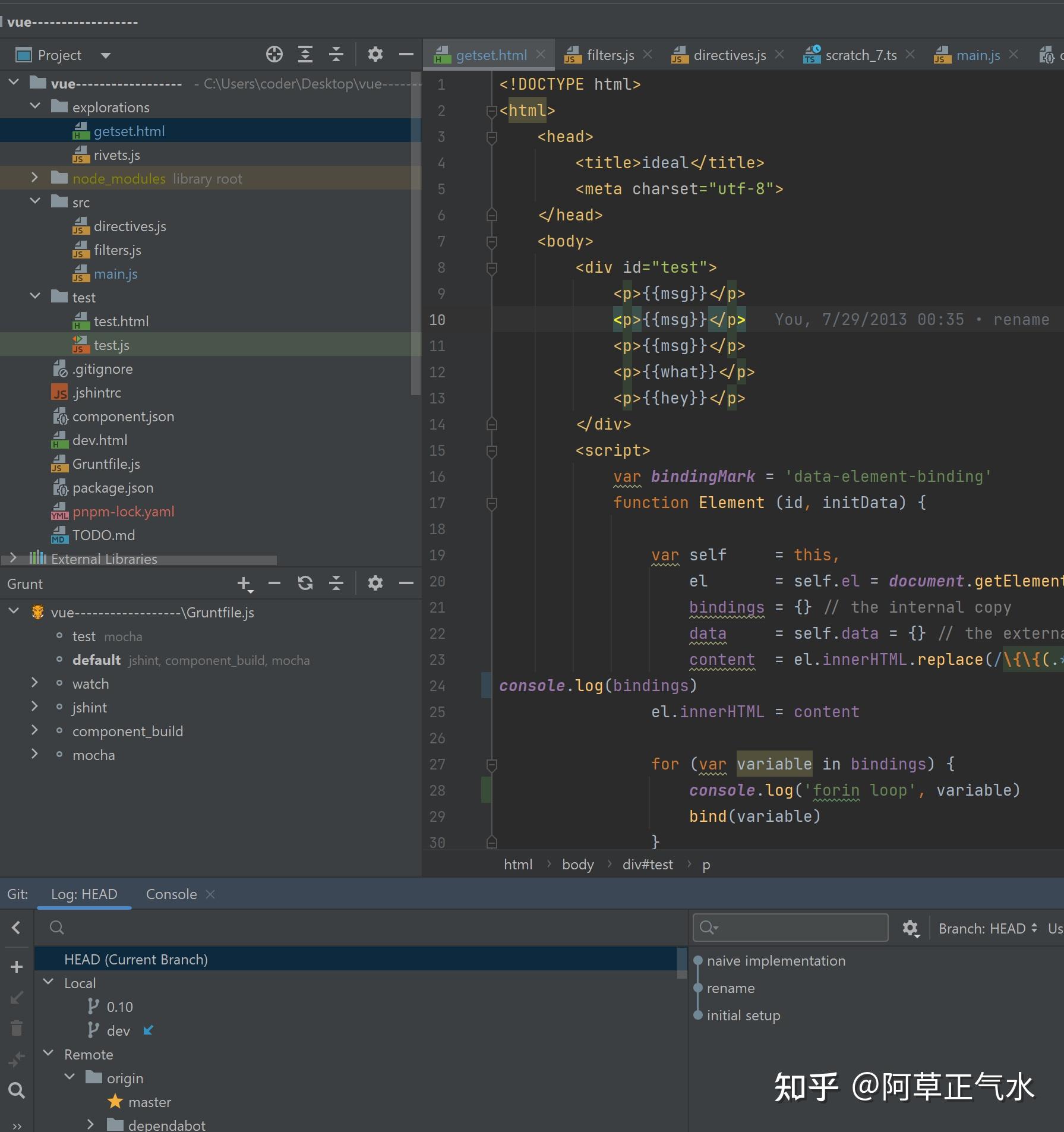 可以看到,最初的尝试就是现在锁熟知的 vue 的样子