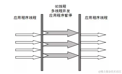 ParNew收集器: 新生代采用复制算法,老年代采用标记-整理算法。利用多线程处理,单指GC线程。应用程序还是中断的