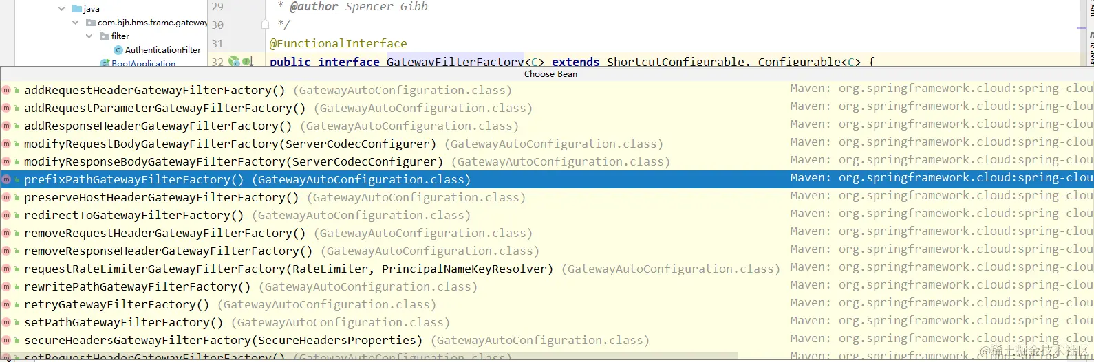开始解析的时看到了,我们需要把断言和过滤器列表都加在进来,那spring是如何加载的呢?是根据方法体内传入的类型找到所有实现了断言和过滤器工厂接口的类并且进行获取实例,我们仔细这些工厂的实现类,就会找到我们的使用的一些属性,比如我们例子中的PrefixPath过滤器和Path断言;