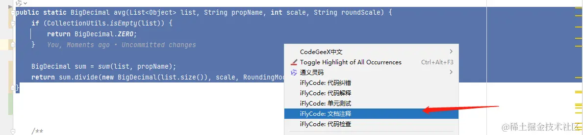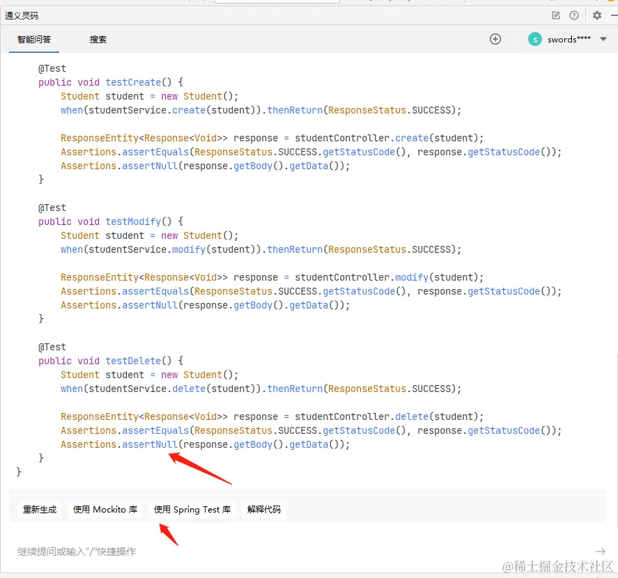 - 选中代码块,通过智能问答框输入“生成单元测试”。
