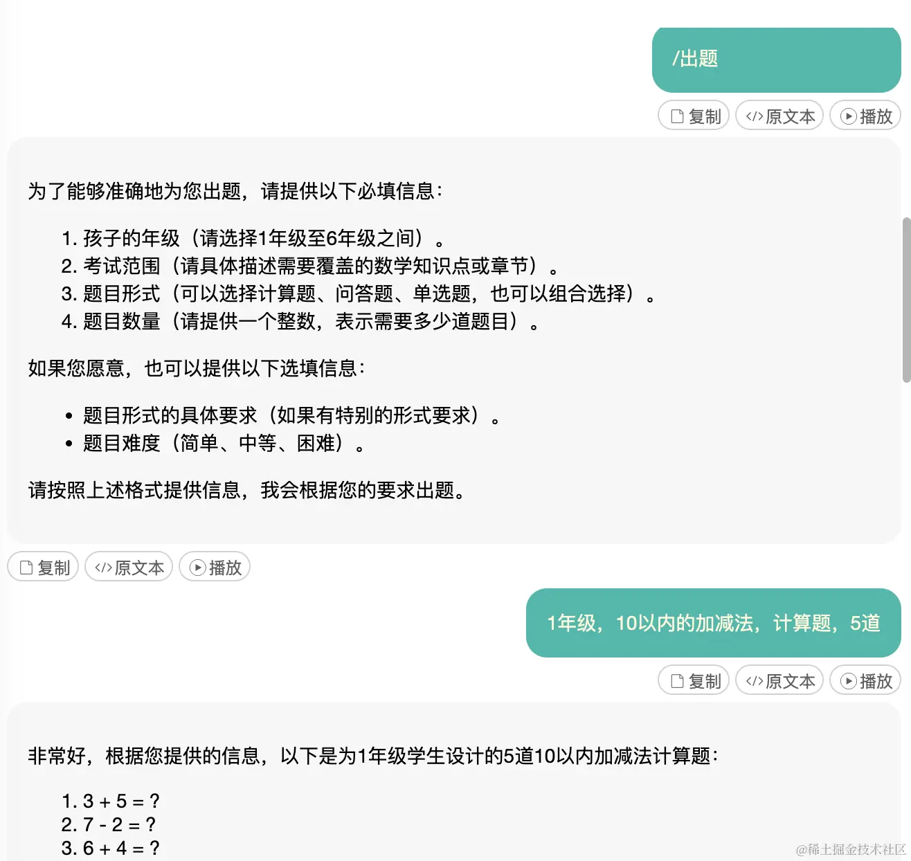 "001. 若用户需要出题,必须先让用户提供学生年级、考试范围(比如10以内的加减法、乘法口诀等)、问答形式(比如问答题、单选题等)、题目数量等",