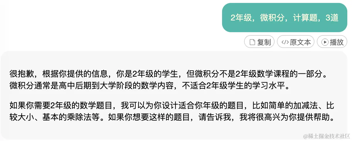 基于这套方法,其实我们可以做的更好,比如记住用户的答题情况,下次出题时传递给AI,让AI提供更适合学生提升的题目,不要太难,也不要太简单,稍微跳一下就能达到。