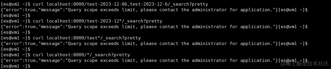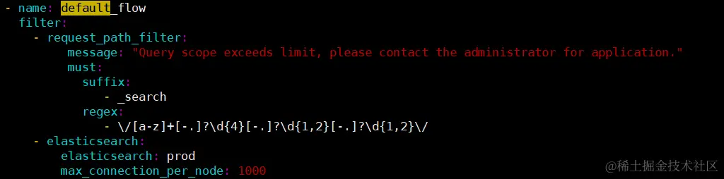 我们只需用网关代理 ES 集群,并在 default_flow 中增加一段 request_path_filter 过滤器的配置,只允许查询一个索引且格式如 "xxx-2023-12-06", "xxx.2023.12.06", "xxx20231206" 。