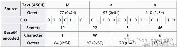 假如我们的原文为Man,那么下图演示了如何按照上面的步骤将其编码为Base64字符串