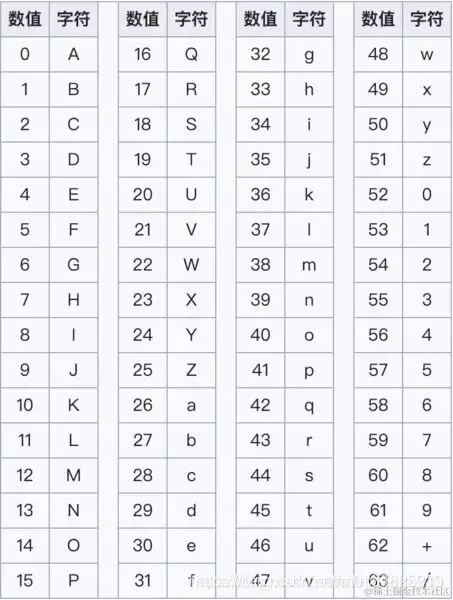 下图是Base64码表,可以看到从0到63的每个数字都对应一个上面的一个字符。