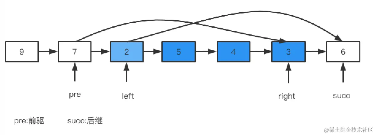 - 第 2 步:把 pre 的 next 指针指向反转以后的链表头节点,把反转以后的链表的尾节点的 next 指针指向 succ。