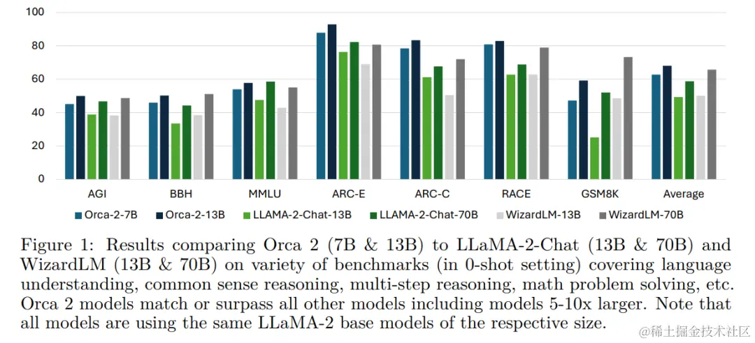 Orca 2有两个版本,分别是70亿和130亿参数。尽管体量小于一些大型模型,如LLaMA-2-Chat和WizardLM,Orca 2在语言理解、常识推理、多步推理等方面的表现不逊色,甚至超越了这些大型模型。