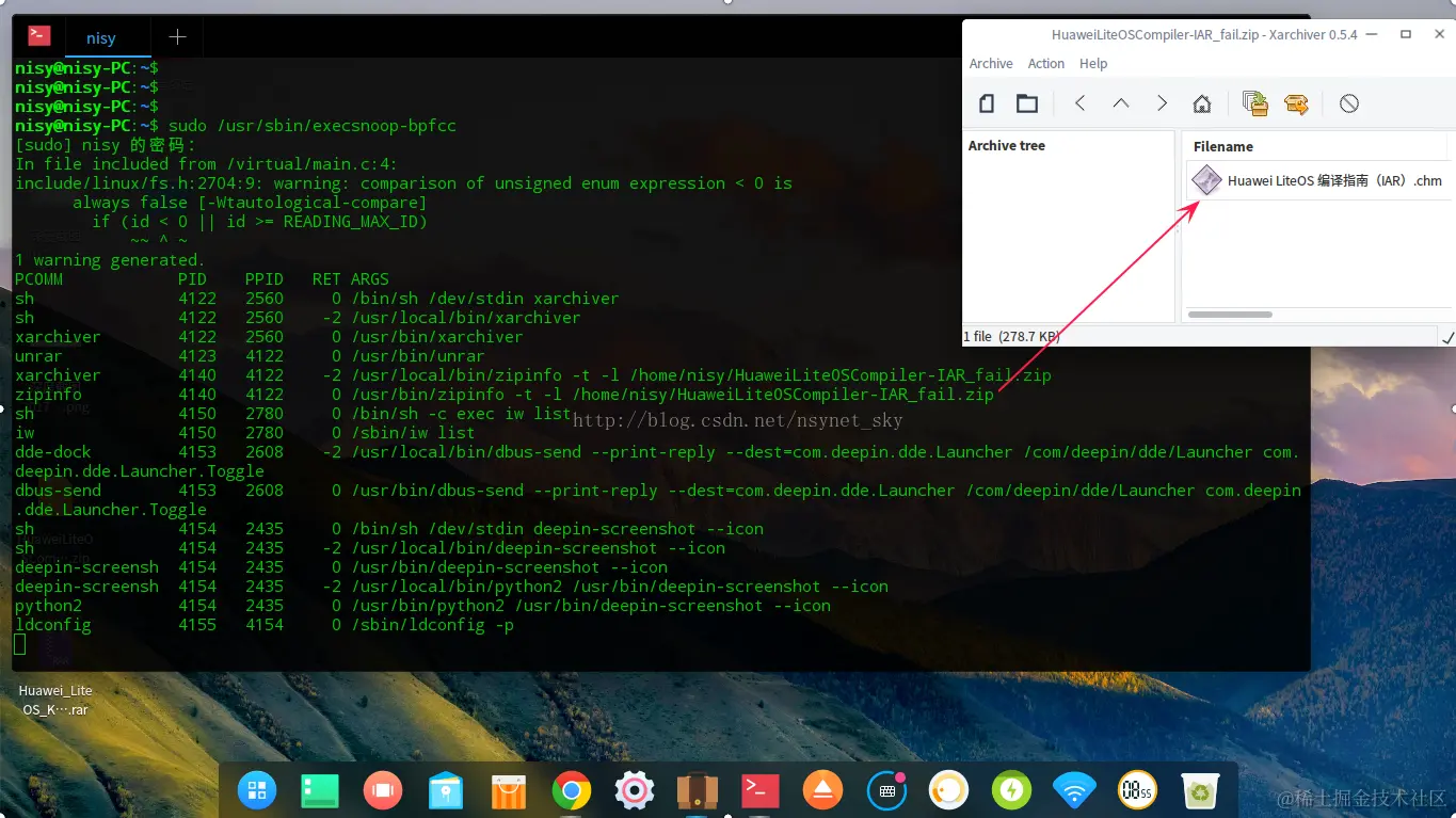 最近得到在WHLUG与deepin大牛沟通,可以用bpfcc 查看后台软件的情况,以下以deepin上xarchiver打开一个文件《HuaweiLiteOSCompiler-IAR_fail.zip》为例: