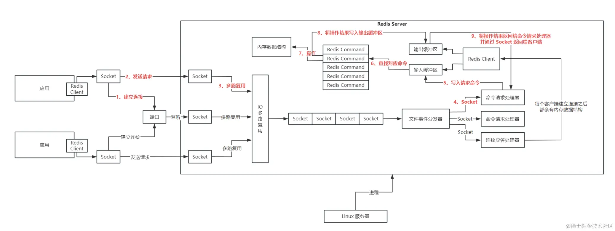 那么对于 redis server 而言,内部为了支撑并发访问的大量的 redis client,redis server 内部就会有几百个 socket,网络连接同时在维持着