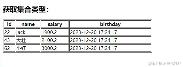 **th:each="user:${users}"**<h2>获取集合类型:</h2> <!--遍历集合:th:each--> <table border="1" width="500"> <tr> <th>id</th> <th>name</th> <th>salary</th> <th>birthday</th> </tr> <tr **th:each="user:${users}"**> <td th:text="${user.id}"></td> <td th:text="${user.name}"></td> <td th:text="${user.salary}"></td> <!--格式化日期--> <td th:text="${#dates.format(user.birthday,'yyyy-MM-dd HH:mm:ss')}"></td> </tr> </table>执行效果:成功获取