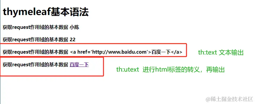 **th:text**属性取值@RequestMapping("demo") public String demo(HttpServletRequest request, Model model) { System.out.println("hello thymeleaf "); request.setAttribute("name", "小陈"); model.addAttribute("age", 22); return "demo"; }<!doctype html> <html lang="en" xmlns:th="http://www.thymeleaf.org"> <head> <meta charset="UTF-8"> <title>测试thymeleaf语法</title> </head> <body> <h1>thymeleaf基本语法</h1> thymeleaf取值的方式和jstl差不多,不过必须要在html标签里使用,通过${},括号 里面填入作用域存的属性名 <h4>获取request作用域的基本数据 <span **th:text="${name}"**></span></h4> <h4>获取request作用域的基本数据 <span **th:text="${age}"**></span></h4> </body> </html>-