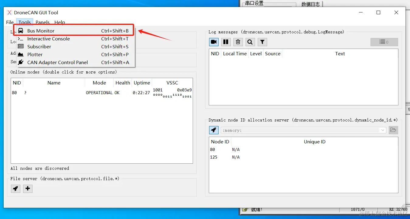 此时我们可以看到,在UartAssist串口调试助手的数据日志窗口中打印的mode和time不再是-1了。然后我们点击dronecan_gui_tool左上角的Tools,再点击下拉框中的Bus Monitor打开数据监视窗口监看125节点数据,也就是canv2调试器的数据。