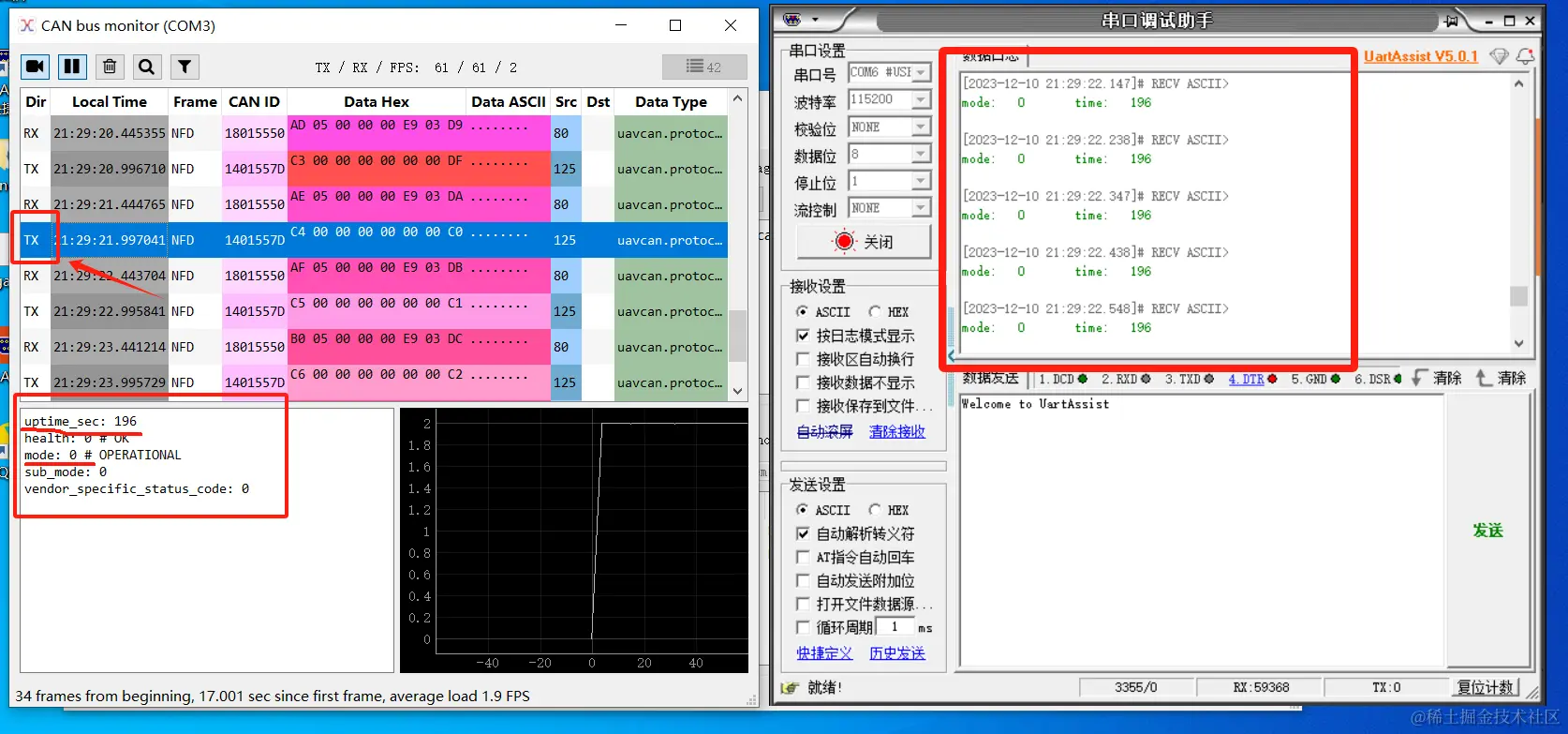 在数据监视窗口存在两种类型数据,TX和RX,TX表示节点发送的数据,RX表示节点接收到的数据。我们可以在监视窗口中看到,125节点设备即canv2调试器会以每秒一次的频率向can-convertor转换器发送数据(TX)。在监视窗口中选中一条发送数据(TX)。可以看到,发送的数据中存在uptime_sec和mode字段,Lua脚本中dronecan.get_Node_Time()和dronecan.get_Node_Mode()函数从125节点TX数据中分别读取uptime_sec和mode字段值。在Lua脚本中代码以每秒10次的频率打印canv2调试器发送过来的数据。由于canv2调试器是以每秒一次的频率发送数据。所以在UartAssist日志窗口中,我们能够看到,窗口中一秒内打印的10条数据相同。例程执行成功。