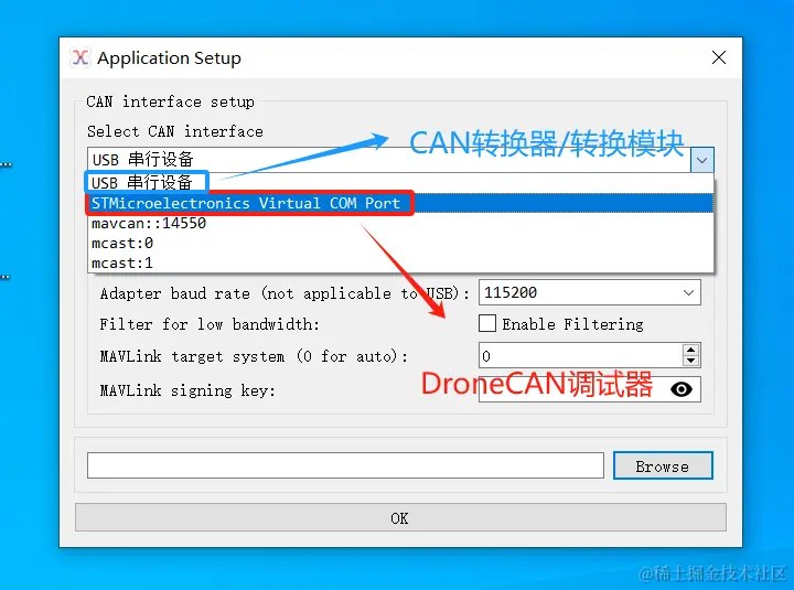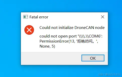 我们将canv2调试器端也连接到电脑上。打开dronecan_gui_tool,此时dronecan_tui_tool将识别到两个串口连接设备,分别为USB串行设备和STMicroelec......。USB 串行设备是我们连接的can-convertor转换器,STM...则是我们的刚刚接入的canv2调试器。我们可以尝试选中USB 串行设备,点击“OK”连接,dronecan_gui_tool会提示拒绝访问错误,这是因为UartAssist串口调试助手已经占用了can-convertor转换器设备。