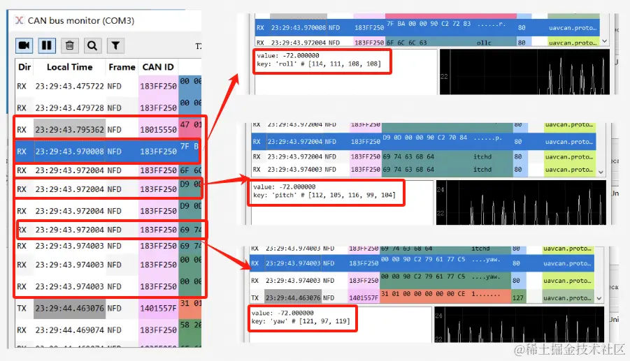 我们此时在dronecan_gui_tool中打开监控127节点的Bus Monitor数据监视窗口,监看canv2调试器从can-convertor转换器接收到的数据RX。我们看其中一组接收到的数据(RX)。
