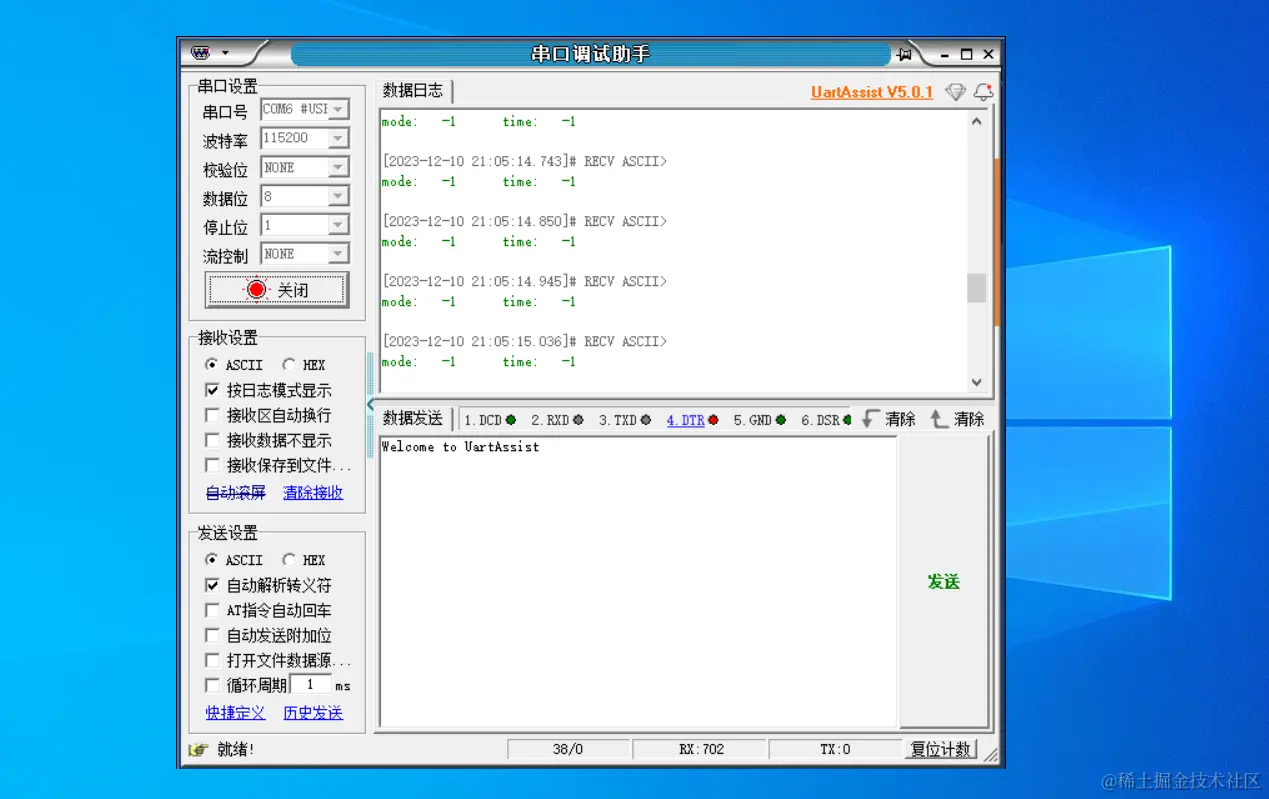 我们开始调试例程。打开UartAssist串口调试助手,在UartAssist中将识别到一个#USB 串行设备,选中它,点击打开,便可以在UartAssist的数据日志窗口中看到调试信息,数据日志窗口中以每秒10次的频率打印两个get方法获取的数据。此时获取到mode和time值都为-1,说明并没有获取到数据。