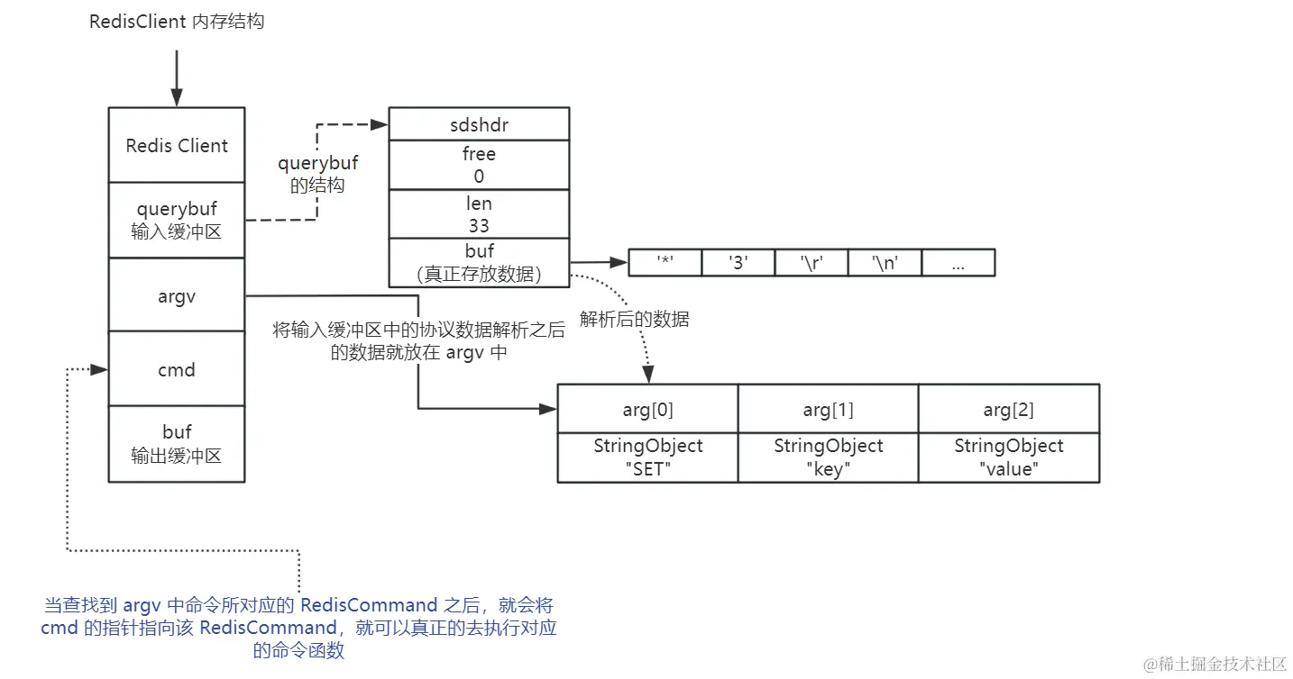 那么这个协议数据在 server 中的 Redis Client 中,就会被解析成 argv 的一个参数,也就是具体的命令,如下图: