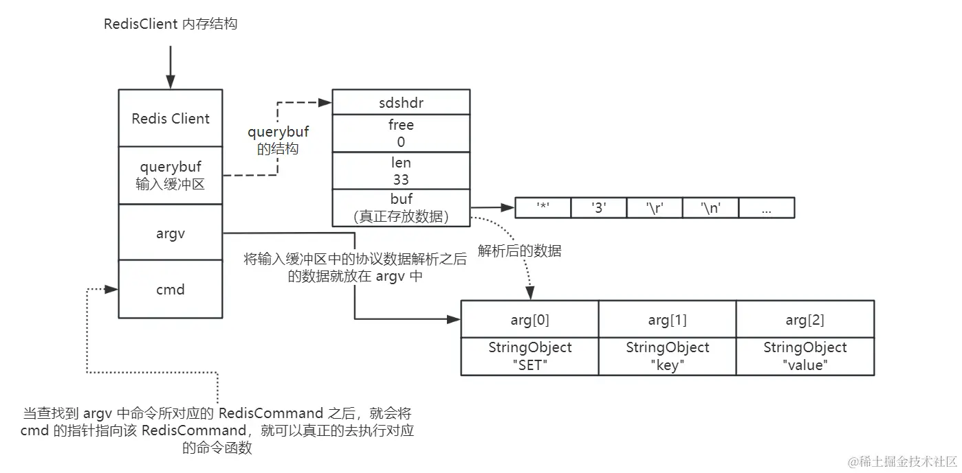 对于 set key value 命令来说,通过协议组织成上边的数据,那么从 client 端发送到 server 需要序列化成字节数据流,之后再通过 socket 进行传输,server 端收到字节流数据之后,会进行反序列化,将字节流数据转为了 *3\r\n$3\r\nSET\r\n$3\r\nkey\r\j$5\r\nvalue\r\n,这个数据就会被放到 server 端的 RedisClient 的输入缓冲区中