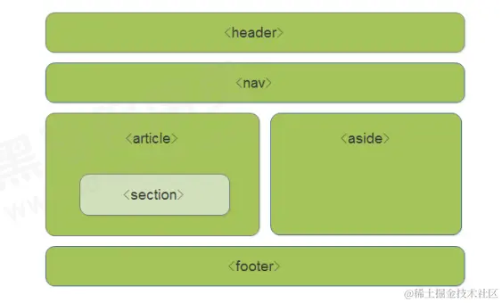<header>:头部标签<nav>:导航标签<article>:内容标签<section>:定义文档某个区域<aside>:侧边栏标签<footer>:尾部标签