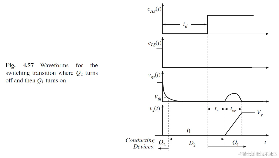 下图展示了实际电流和电压波形, tr为D2 reverse recovery time. 在tvr时间内, 由于Vs(LX)在上升, 给Cgd充电, 电流: igd=Cgd*dvs/dt. 因为driver的电流idr=0, 这股igd电流充Cgs造成Vgs上升. 当Vgs上升到Vth以上会造成Q2误开启, 造成Q1和Q2串通.