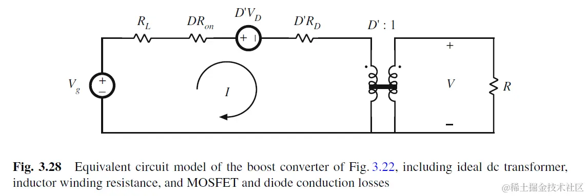 利用DC transformer可以构建等效电路模型. 这对以后小信号模型推导很有用. 牢记转换到R端的左侧的电压电流和R的变换比是D`^2.