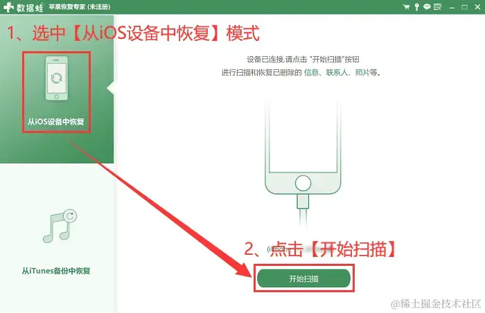 步骤3:选择**【从iOS设备中恢复】的模式后,点击【开始扫描】**按钮,等待软件扫描您的iOS设备。