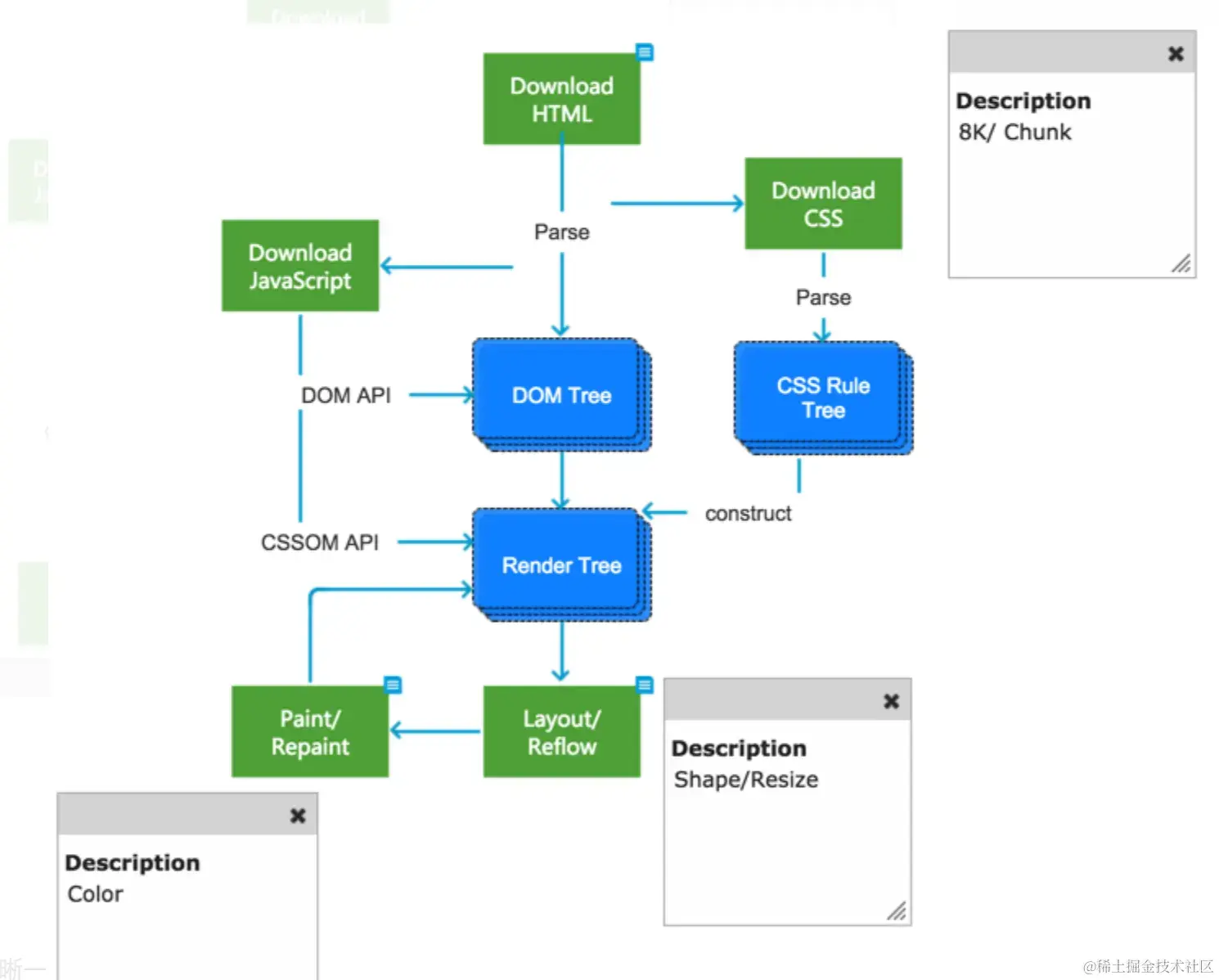 dom 树构造好了之后,就是根据 dom 树和 css 样式表来构造 render 树了,这个才是真正的用于渲染到页面上的一个一个的矩形框的树,网页渲染是浏览器最复杂、最核心的功能,对于 render 树上每一个框,需要确定他的 x y 坐标,尺寸,边框,字体,形态,等等诸多方面的东西,render 树一旦构建完成,整个页面也就准备好了,可以上菜了。需要说明的是,下载页面,构建 dom 树,构建 render 树这三个步骤,实际上并不是严格的先后顺序的,为了加快速度,提高效率,让用户不要等那么久,现在一般都并行的往前推进的,现代的浏览器都是一边下载,下载到了一点数据就开始构建 dom 树,也一边开始构建 render 树,构建了一点就显示一点出来,这样用户看起来就不用等待那么久了