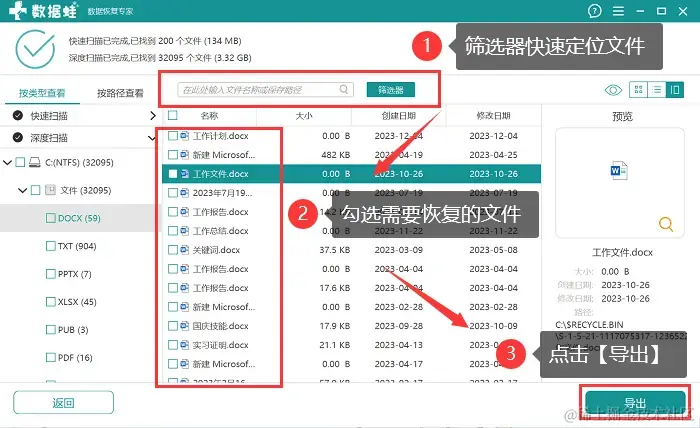 第4步:深度扫描完成后,会呈现比较多的文件,用户可一一进行查看,也可以直接在 【筛选器】 快速限定文件条件,以更好的找到需要恢复的文件,将其勾选上后,点击【导出】。