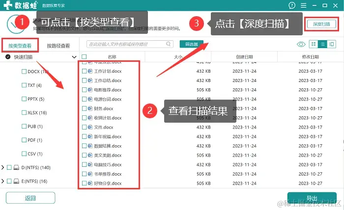 第3步:快速扫描完成后,用户可以先对部分扫描到的结果进行查看,查看时可先点击【按类型查看】 ,选择需要查看的文件类型,并对需要恢复的文件进行勾选,此次扫描若没有很好的找到需要恢复的文件,可以点击【深度扫描】 ;