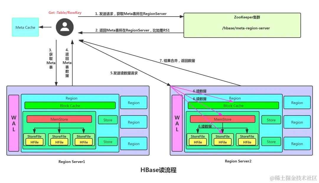 Meta table存储了所有的region信息,Meta table储存在zk中,客户端在第一次读写访问或者region失效时,都会先访问zk,根据rowkey从Meta table获取region server的信息,然后客户端再去访问对应的region server,进行对应的读写操作。
