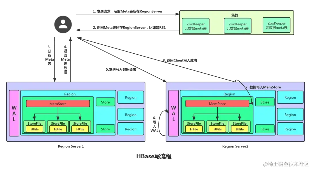 Zookeepper中存储了hbase:meta 表,这张表维护了整个集群所有的 Region 信息,client首先会访问zk,查询hbase:meta 表信息,为了查询性能会将hbase:meta 表信息缓存在客户端。